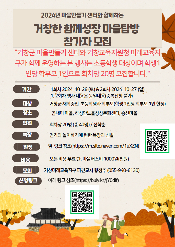 2024. 거창한 함께성장 마을탐방 프로그램을 다음과 같이 안내하오니 관심있는 학부모님은 참고하시기 바랍니다.