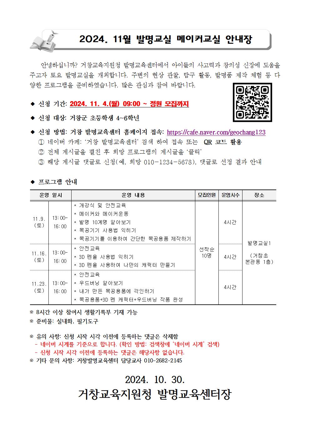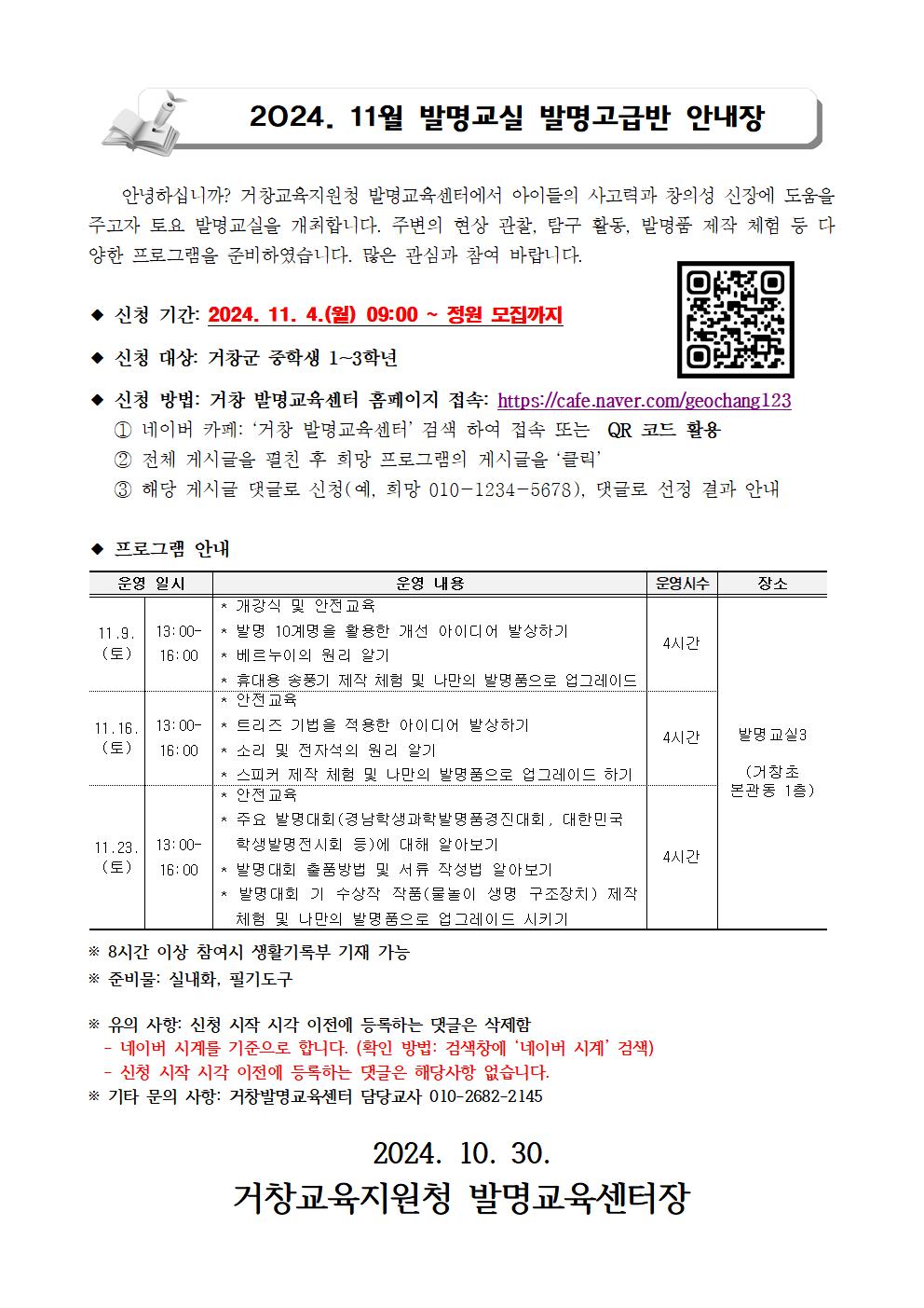 2024. 거창발명교육센터 11월 발명교실 안내 드립니다. 자세한 사항을 아래 첨부 파일을 참고해주시길 바랍니다.
