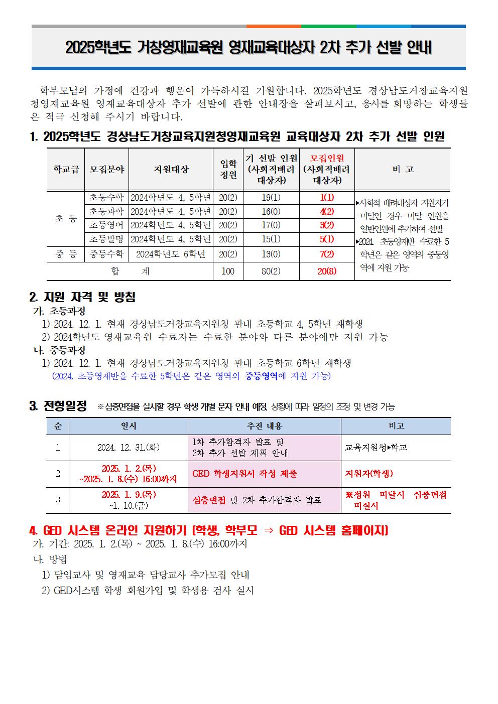 2025학년도 거창영재교육원 영재교육대상자 1차 추가 모집 합격자 및 2차 추가 선발 안내 드립니다.