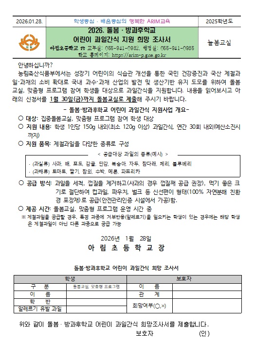 2026. 돌봄교실 어린이 과일간식 수요조사 안내